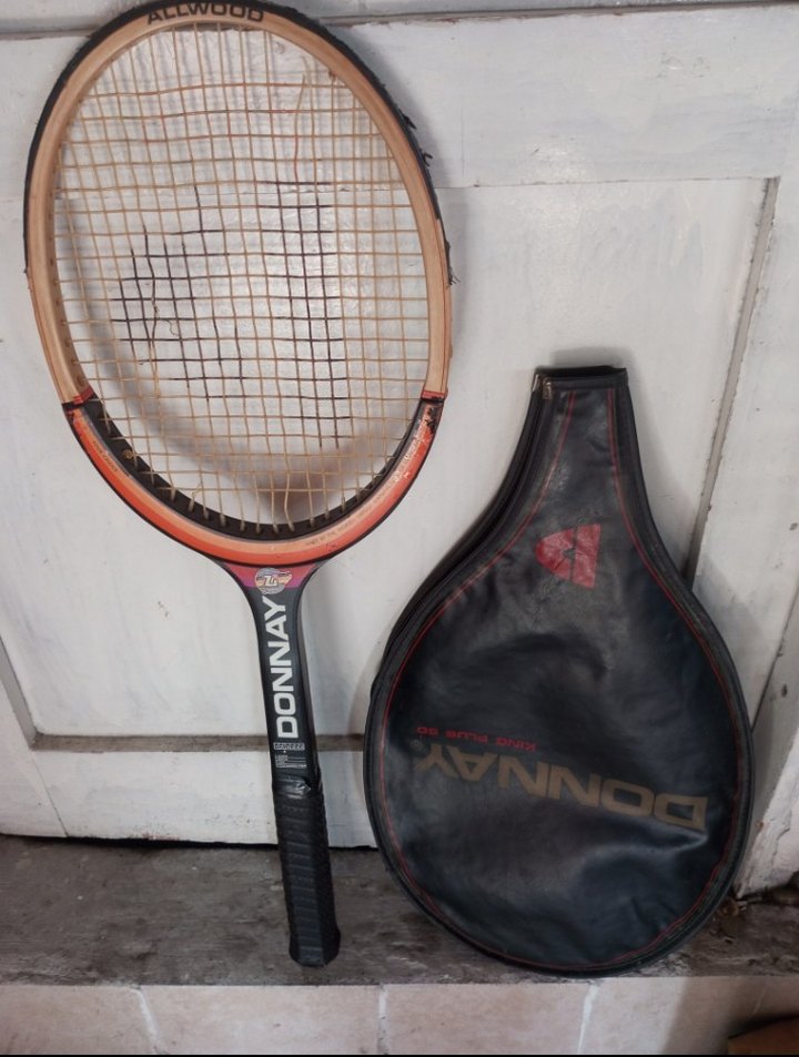 Turuncu ve koyu renkli ahşap Donnay tenis raketi ve uyumlu koruyucu kılıf takımı.