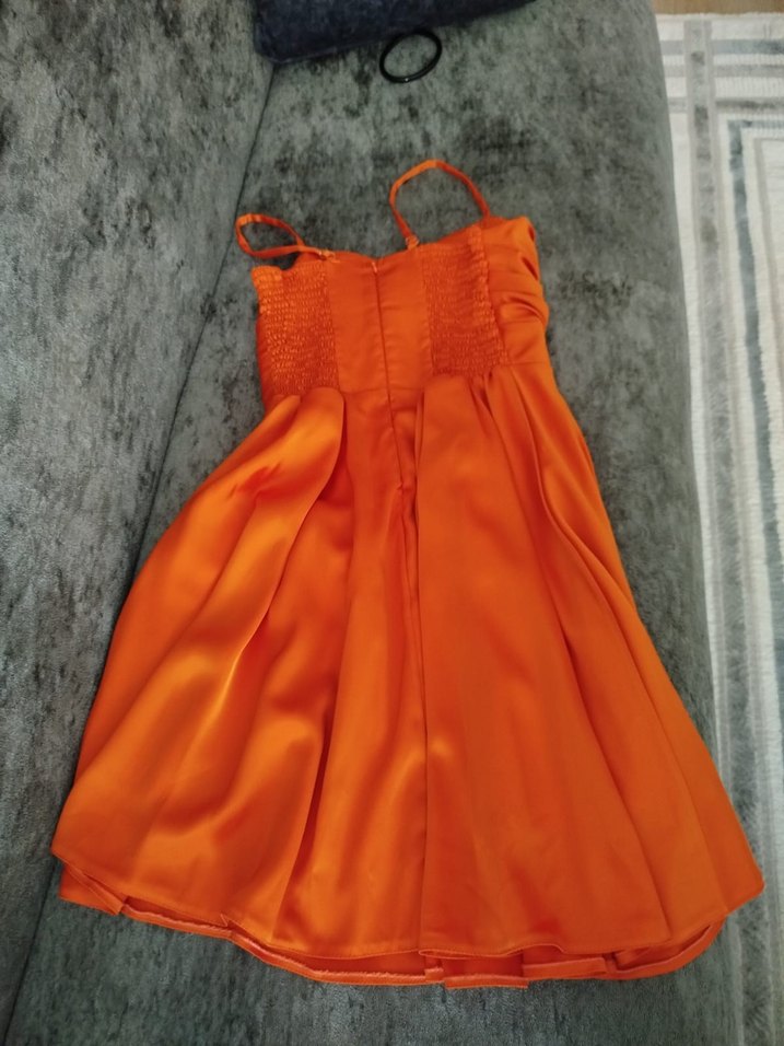 Turuncu, drapeli, askılı midi elbise, bol kesim ve parlak kumaşla parti için vintage bohem tarzını yansıtıyor. 12 yaş çocuk elbise.