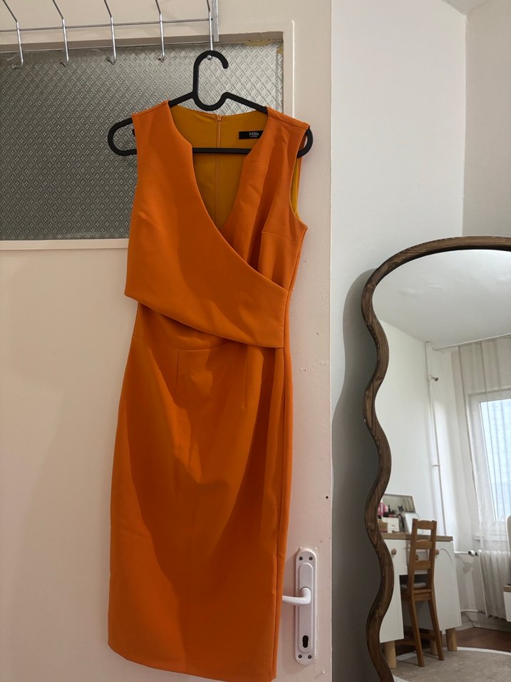 Parlak turuncu kumaştan, drapeli ve V yakalı, kolsuz midi boy ofis elbisesi, çağdaş bir tarz sunar.