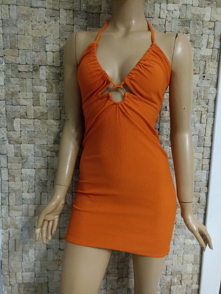 Turuncu renkte, askılı ve V yakalı, drapeli detaylara sahip, sentetik kumaştan üretilmiş dar kesim mini elbise. Parti için uygun. Beden 38 uzunluk 81 cm iki kol arası 36 cm