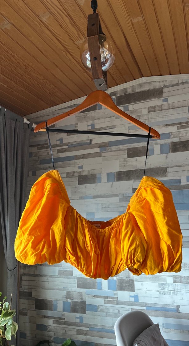 Sarı, straplez, drapeli ve bol kesim mini bustiyer. Keten kumaştan yapılmış, parlak görünümlü, sokak modası ve açık hava kullanımı için uygun.