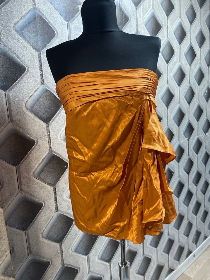 Parlak turuncu kumaştan, drapeli ve straplez olan bu mini elbise, dar kesimiyle çağdaş ve şık bir parti görünümü sunar. Kolsuz tarzıyla dikkat çeker.