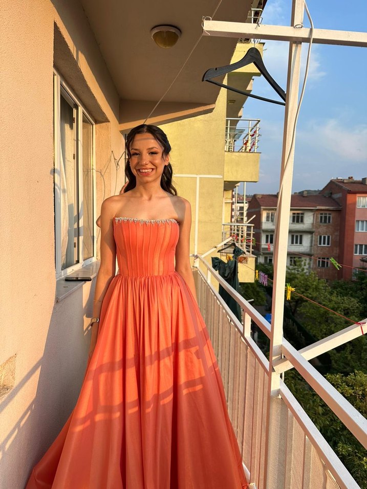 Turuncu Drapeli Straplez Uzun Abiye Elbise