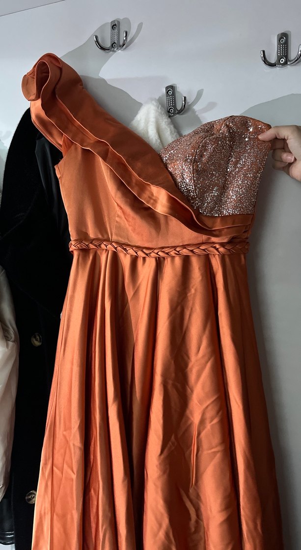 Uzun, tek omuz ve kolsuz abiye elbise. Parlak turuncu üst kısmı ışıltılıdır 2 kez giyildi s beden. Tekliflere açığım