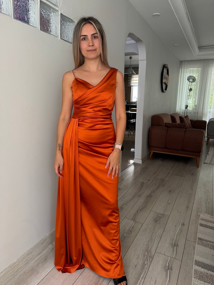 Turuncu Drapeli Uzun Abiye Elbise