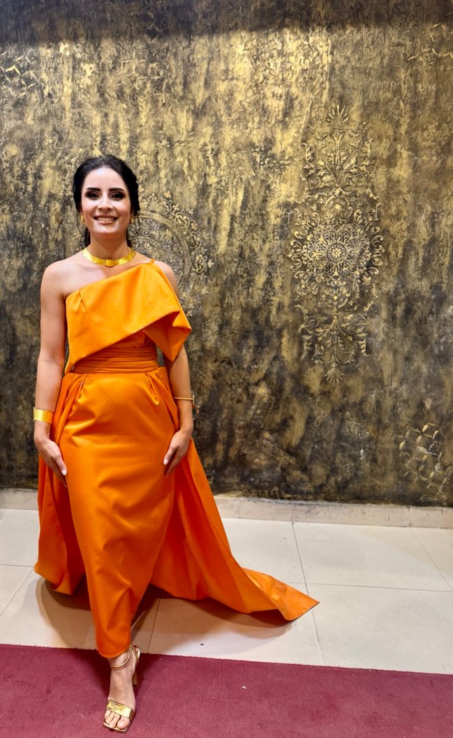 Askılı olmayan, kolsuz kadınlar için drapeli, parlak turuncu renkli ve etnik desenli uzun abiye elbise. Düzenli kesim ve modern avant-garde tarzda, düğünler için uygun. ✨