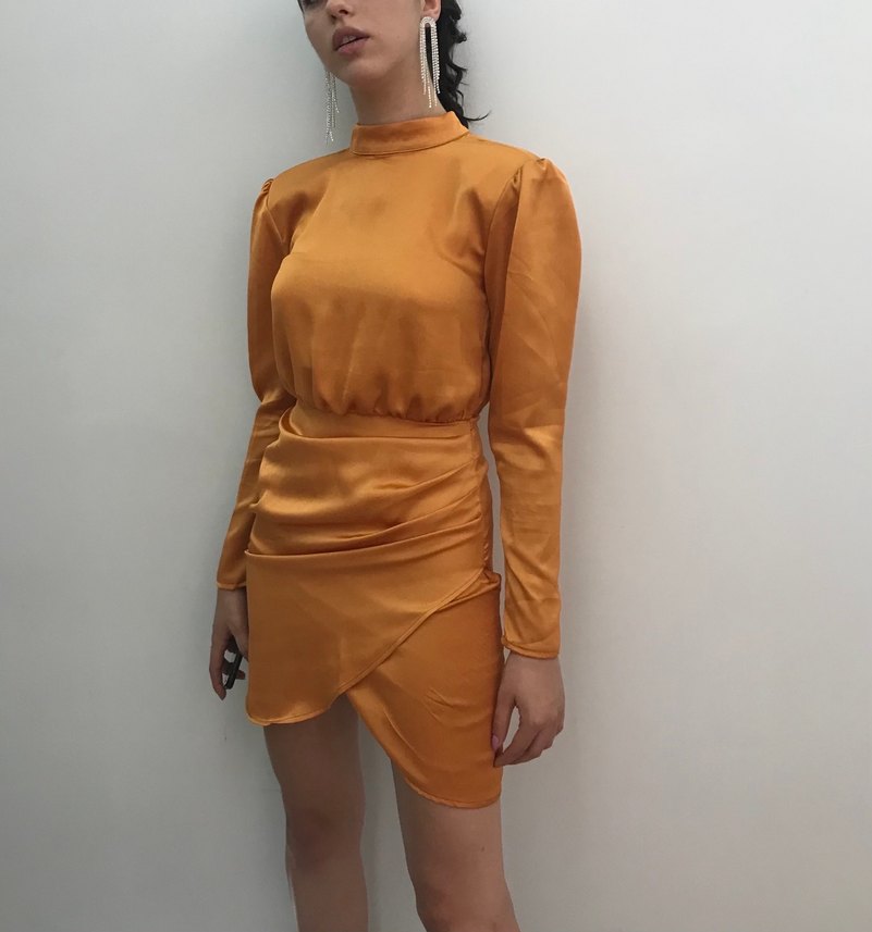 Parlak turuncu kumaştan, uzun kollu, yüksek yakalı ve drapeli tasarıma sahip, vücuda oturan sırt dekolteli elbise