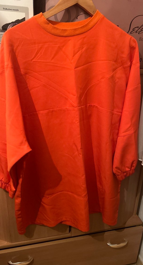 Turuncu renkli, drapeli tasarıma sahip uzun kollu kadın tunik. bol kesim ve uzun boylu, günlük ve sokak stiline uygun. Standart beden