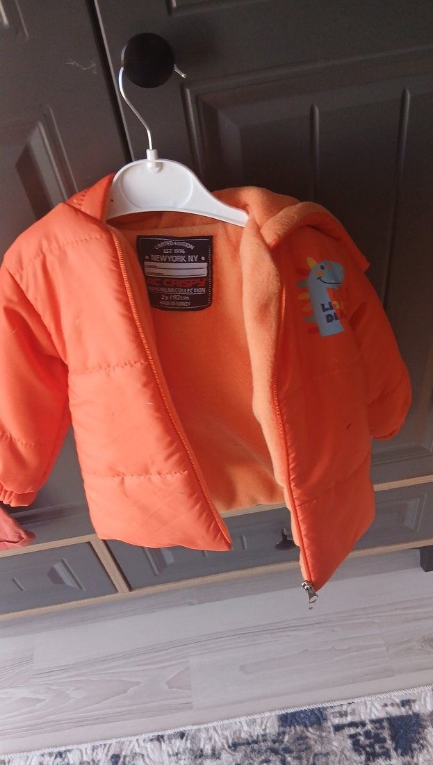 Turuncu parlak renkte, düğmeli ve kesimli yakalı, baskılı desenli erkek çocuk ceketi, yumuşak ve sıcak kumaştan üretilmiştir. 1 2 tas uygun