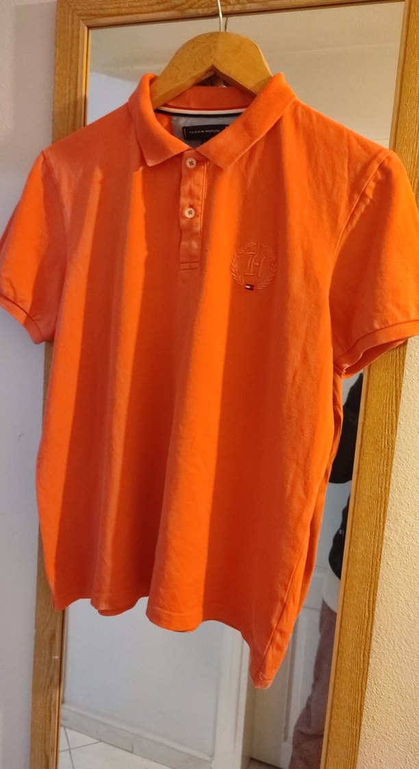 Kısa kollu, düğmeli yakalı erkek polo tişört. Rahat kesim, parlak turuncu renkte, yumuşak sentetik kumaştan üretilmiştir. Marka: Tommy Hilfiger (Orijinal logolu ve etiketli) Beden: L Renk: Mercan / Somon Kumaş: %100 Pamuklu, klasik polo dokusu.