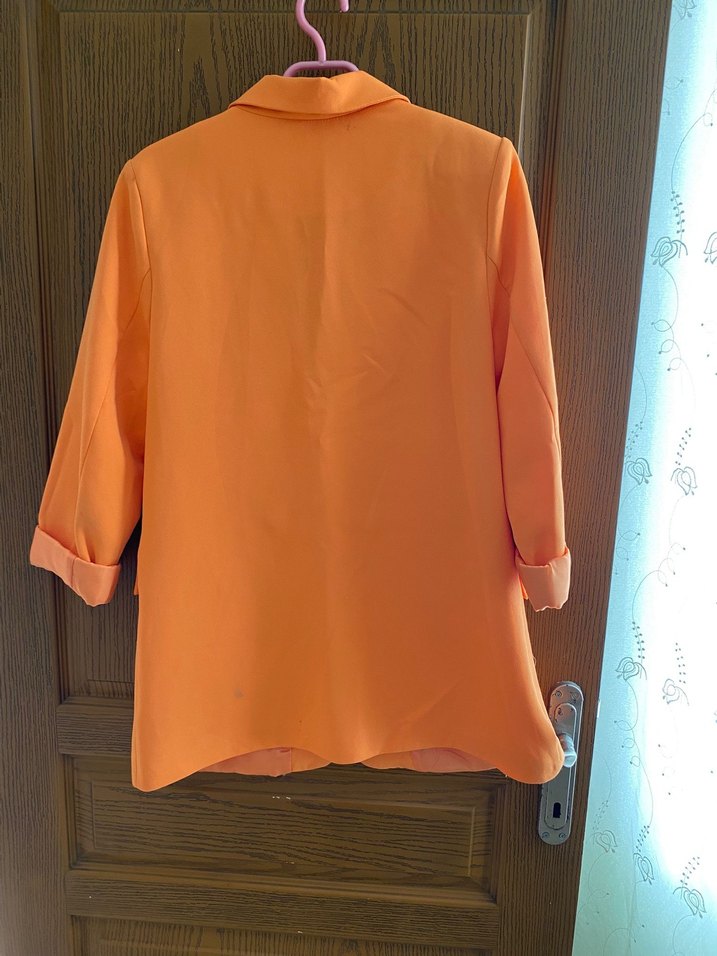 Turuncu renkte, düğmeli ve notlu yaka detaylı, uzun kollu, bol kesim kadın blazer. günlük sokak stiline uygundur.