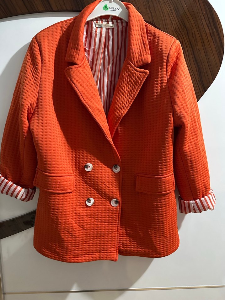 Turuncu düğmeli ve kesimli yakalı kadın blazer cekettir. Sentetik kumaştan, regular fit ve askılı kollarla günlük kullanıma uygundur.