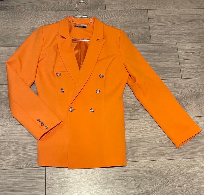 Turuncu, parlak kumaştan, düğmeli ve normal kesim uzun kollu kadın blazer ceket. Ofis ve günlük kullanıma uygundur.(ölçülerde hata olabilir )