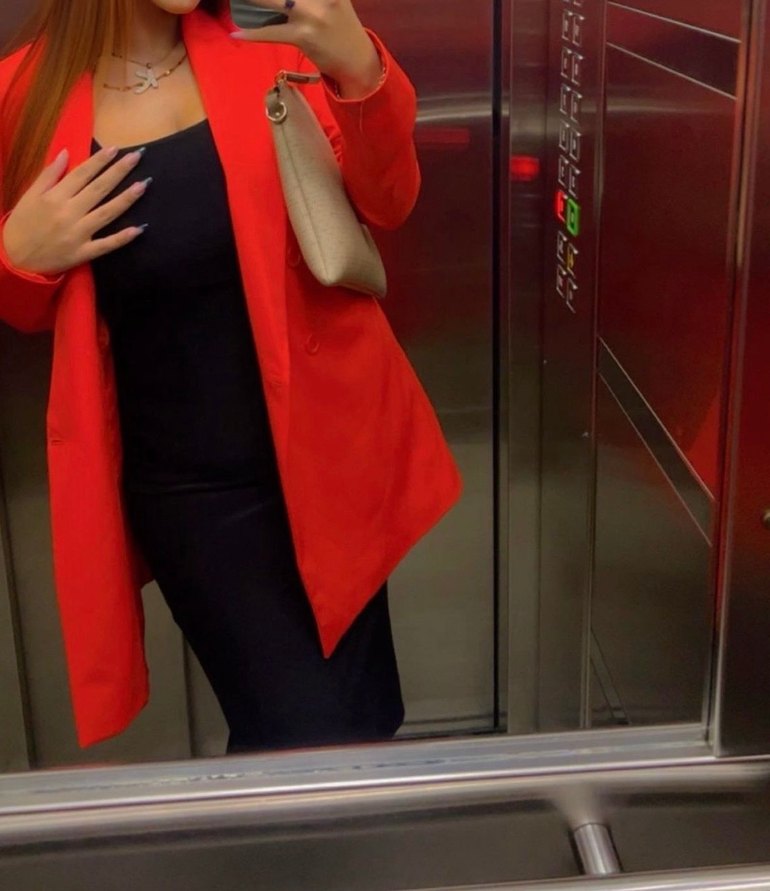 Turuncu kadın blazer, düğmeli, diz boyu, normal kesim, uzun kollu ve kesik yakalıdır. Günlük kullanıma uygun, sentetik kumaştan yapılmıştır.