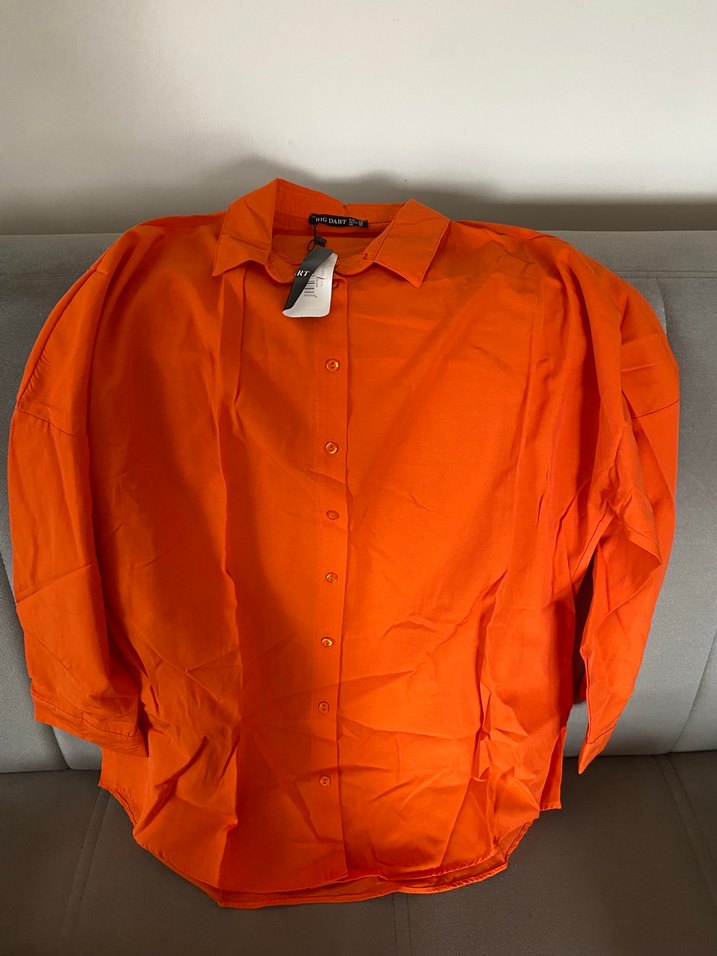 Turuncu renkli, düğmeli, uzun kollu ve yakalı kadın gömleği. İpeksi dokusu ve parlak görünümüyle rahat ve salaş bir kesime sahip, günlük kullanıma uygundur.