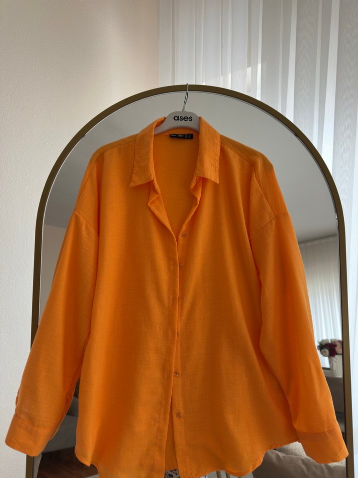 Hiç giyilmedi 40 beden bigdart marka tamamen pamuklu Turuncu renkli, keten kumaştan, düğmeli ve yakalı, uzun kollu, bol kesim kadın gömlek. Parlak dokusu ve normal uzunluğu ile günlük kullanıma uygundur. Minimalist tarzda, desensiz gömlek.