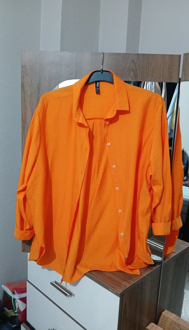 Turuncu, parlak renkli, keten kumaştan yapılmış, uzun kollu ve düğmeli salaş kesim kadın gömleği. Casual tarz için uygundur.