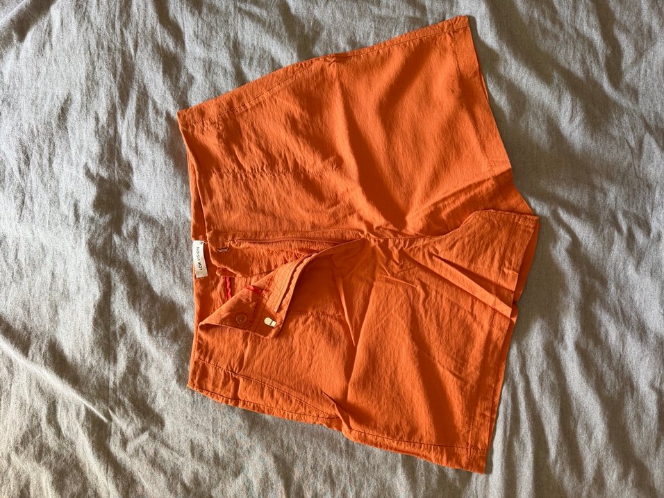 Yumuşak keten kumaştan, parlak turuncu renkte düğmeli ve midi boyda bol kesim hamile şortu. Rahat günlük kullanım için uygundur.