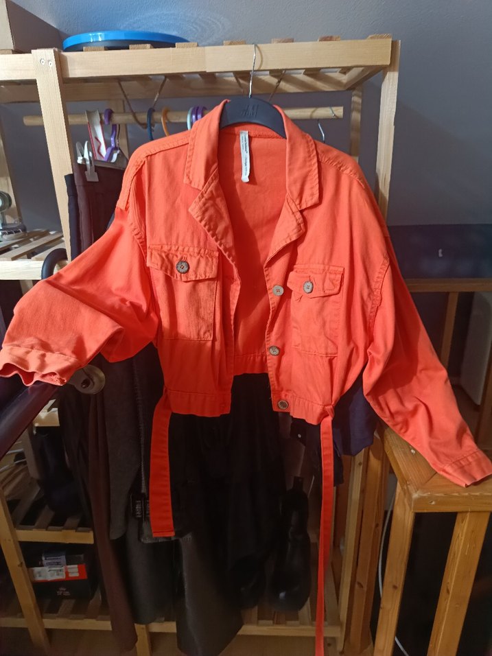 Renkli turuncu kısa ceket, bol kesim, uzun kollu ve çentikli yakalıdır. Düğmeli kapama ve sentetik kumaştan yapılmıştır, günlük sokak stili için uygundur.