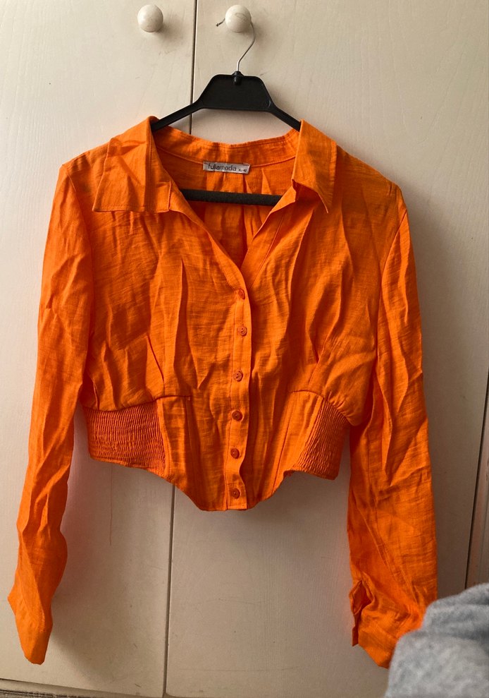 Parlak turuncu keten gömlek, uzun kollu, düğmeli ve yakalıdır. Salaş kesimi ve kısa boyu günlük sokak stili için uygundur. bedeni büyük fakat dar kesin