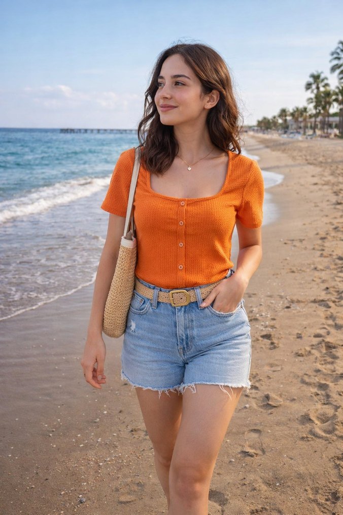 #Turuncu #Düğmeli #Kısa #Kollu #Kadın #Bluz