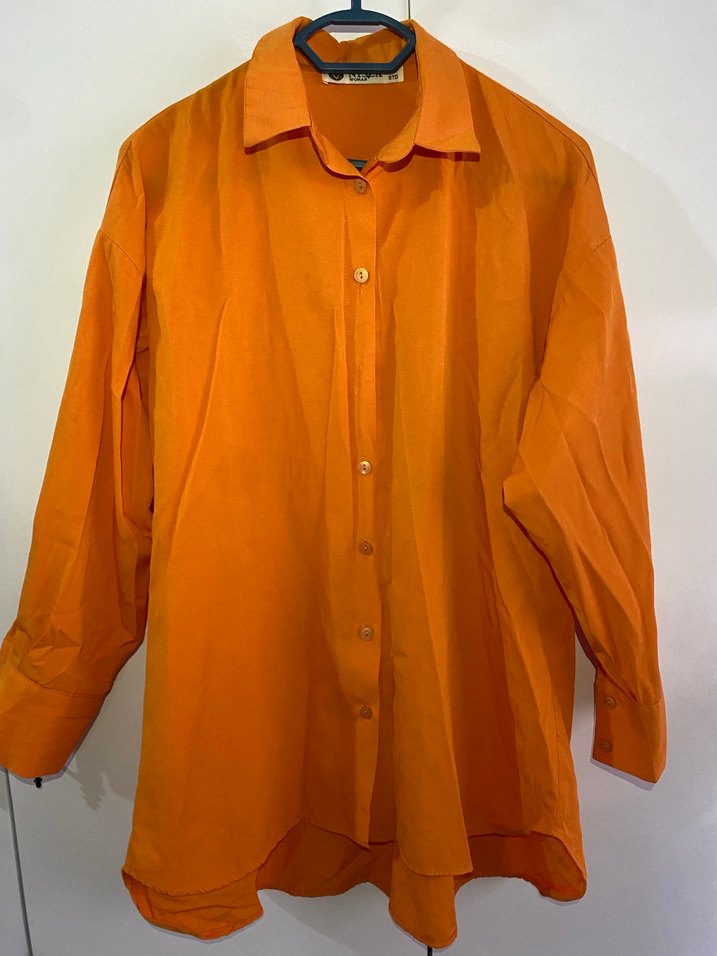 Parlak turuncu keten kumaştan, düğmeli ve uzun kollu, yakalı, midi uzunlukta salaş kesim gömlek. Minimalist ve günlük kullanıma uygun. Hatası yoktur