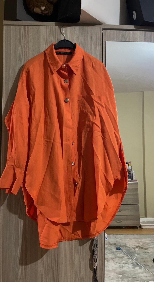 Turuncu renkte, düğmeli, yakalı, uzun kollu keten gömlek. Salaş kesimi ve midi boyu ile günlük rahat stil sunar. İki kol arası 60 cm Tunik boy 70 cm