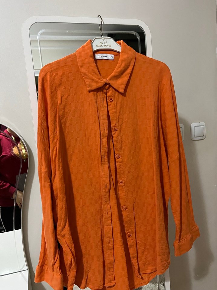 Bol kesim, uzun kollu, düğmeli ve yakalı keten gömlek. Parlak turuncu renkte, günlük rahat kullanıma uygun. M L XL uyumlu salaş model