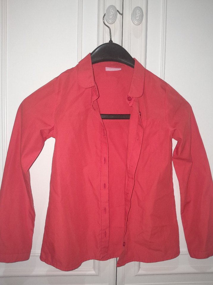 Düğmeli, uzun kollu, yakalı, turuncu keten gömlek. Rahat kesimli ve parlak görünümlü,çocuk için 7,8 yaş