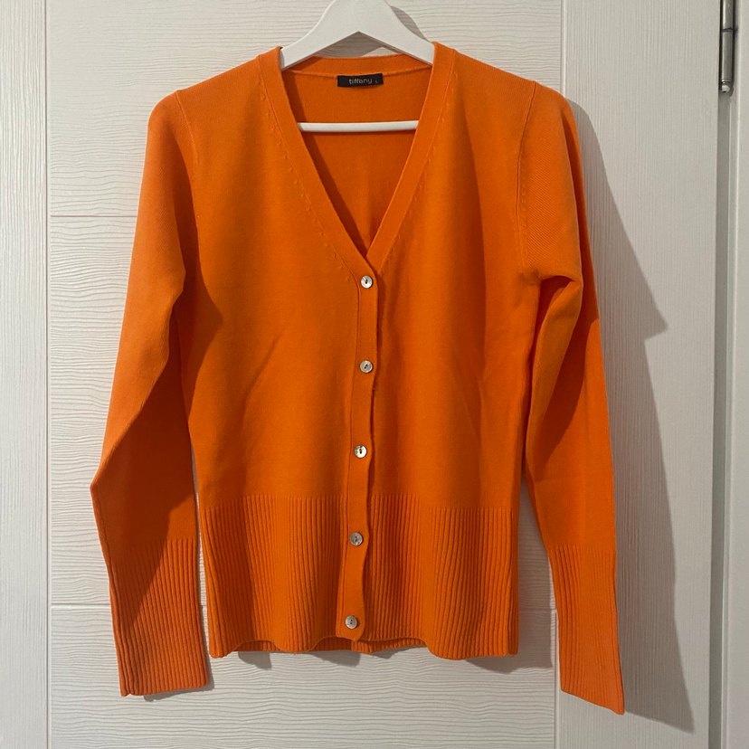 Bu turuncu kadın hırka, uzun kollu ve V yaka olup, yumuşak dokulu ve parlak görünümlü triko kumaştan yapılmıştır. Düğmeli ve normal midi uzunluktadır, gündelik rahat kullanım için uygundur.