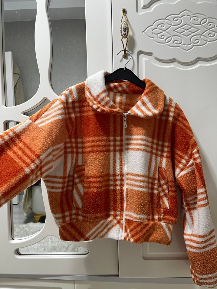 Turuncu ekose desenli, pekuş dokulu kadın mont. Uzun kollu ve bol kesim midi boyda rahat bir stil sunar.