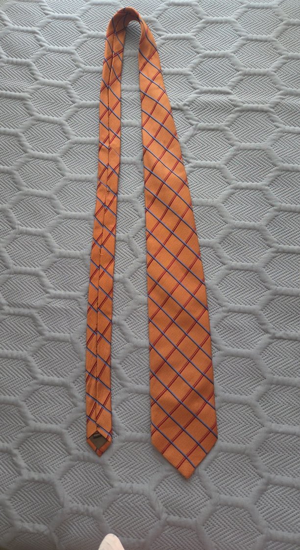 Turuncu zemin üzerine mavi ve gri ekoseli desene sahip erkek kravat. Düzgün kumaştan üretilmiş olup, iş kıyafetlerine renk katmak için uygundur.