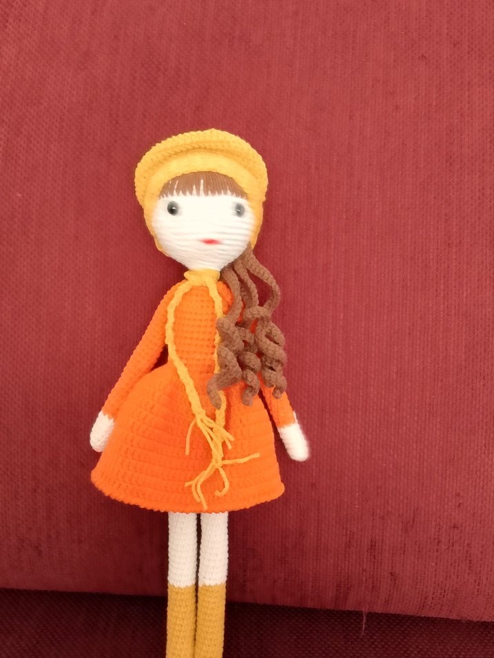 Bu renkli bebek, turuncu örgü elbise ve sarı şapka ile uzun kıvırcık kahverengi saçlara sahiptir. Yumuşak dokuludur.