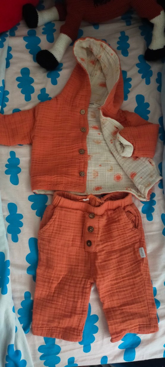 Turuncu renkli, keten kumaştan yapılmış, düğmeli, uzun kollu, yakalı erkek bebek takımı. Bohem tarzda rahat ve şık. 0-3 ay yeni doğan 2 adet zıbın 1 adet kısa kol tişört ve alt üst takım üst kapşonlu hırka çift taraflı dır.