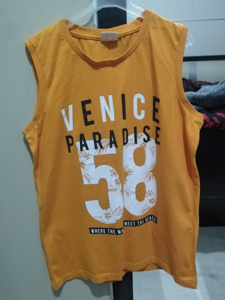 Turuncu renkli, kolsuz ve bol kesimli erkek çocuk tişörtü. Baskılı 'Venice Paradise 58' ve plaj temalı desenler bulunur. Parlak sentetik kumaştan üretilmiştir.Tertemiz hiç bir sorunu yoktur