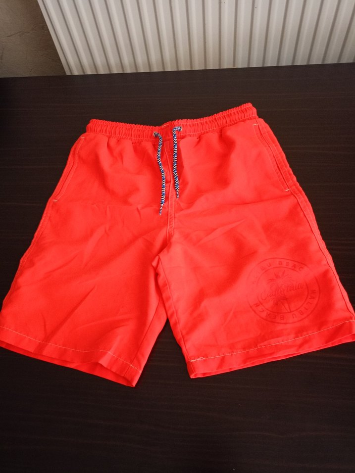 Turuncu renk, bol kesim erkek çocuk yüzme şortu, lastikli bel ve bağcıklı. Canlı, desensiz ve rahat sokak stili için uygundur.