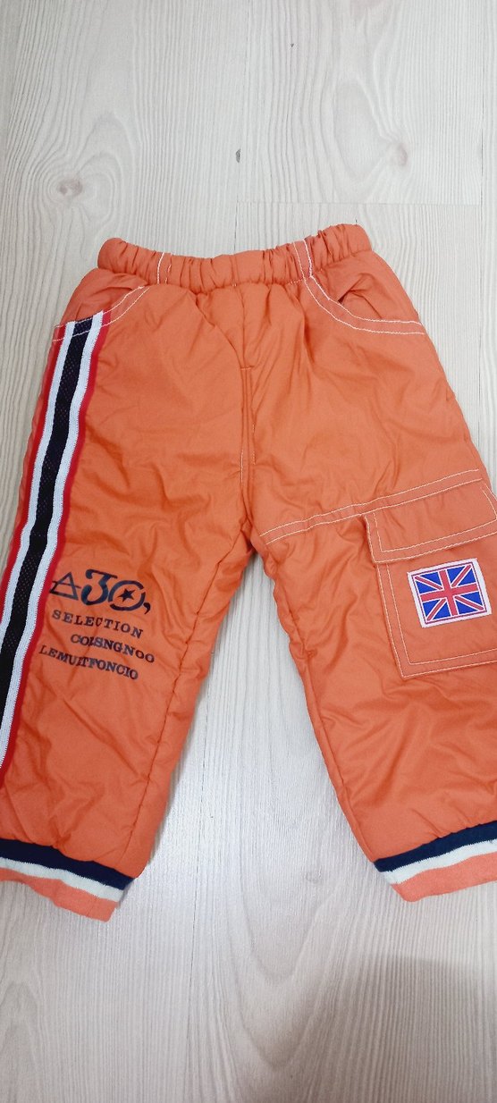 Turuncu renkli, yumuşak dokulu, fit kesim erkek çocuk pantolonu. Yanlarda şeritler, cırt cırtlı cep ve baskılı yazılar bulunur. 1/2 yaş yumuşacık kalın .