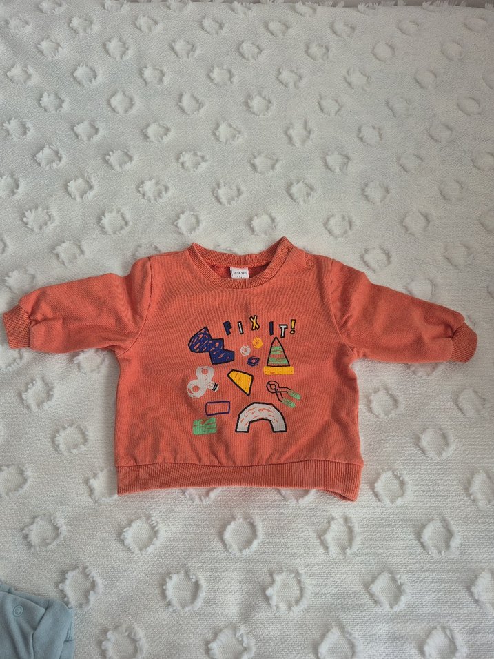 Turuncu renkli, uzun kollu, yuvarlak yaka erkek çocuk sweatshirtü. Yumuşak, sıcak kumaştan örülmüş ve renkli baskılarla süslenmiştir.