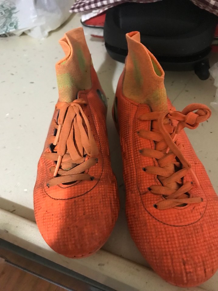Turuncu renkte, bağcıklı erkek futbol ayakkabısı. Kauçuk malzemeden ve çorap görünümlü üst kısmıyla sokak stiline uygun. Spor için ideal. ⚽