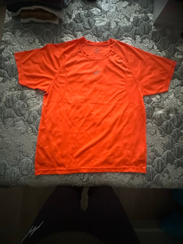 Turuncu renkte, kısa kollu ve salaş kesime sahip erkek tişörtü. Yumuşak sentetik kumaş, spor için uygun 4 Tilprt 4 şort hepsi 1509 TL