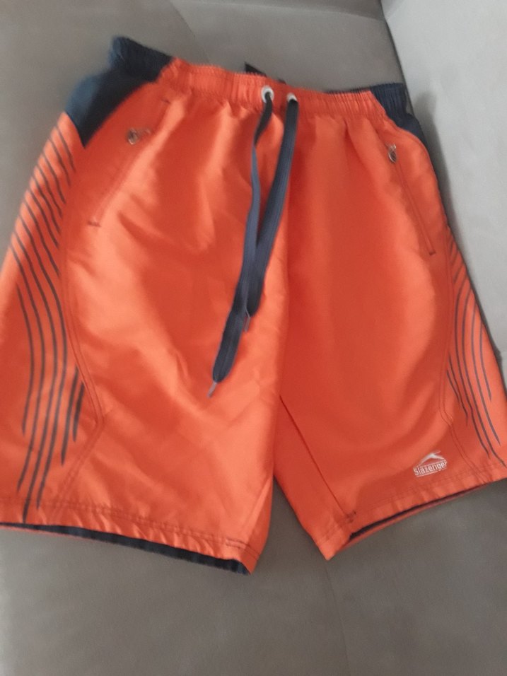 Turuncu renkli, sentetik kumaştan, bel detaylı ve yanlarda çizgili erkek mini spor şort. Rahat kesimli ve şık tasarımlı.