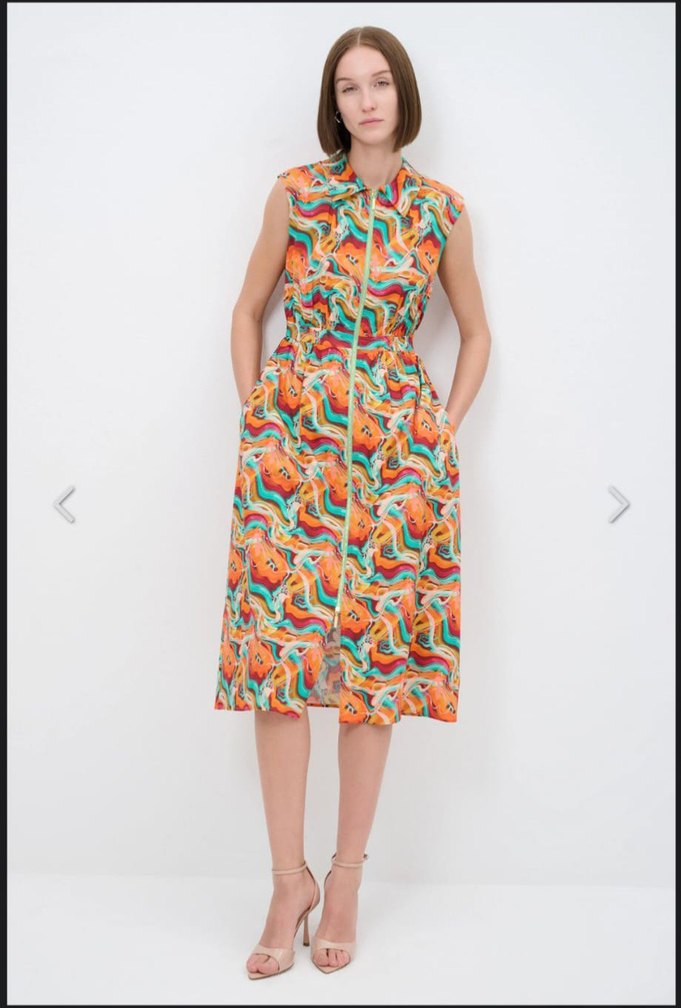 Kolsuz, yüksek yakalı ve fermuarlı ön kısmı olan bu uzun elbise, hafif sentetik kumaştan yapılmıştır ve çok renkli bağlama deseni taşır. Rahat kesimiyle günlük kullanıma uygundur.