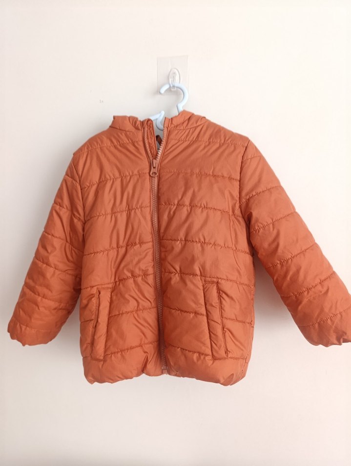 Fermuarlı, turuncu erkek çocuk montu, gri yumuşak astar ve yakası notched lapel stilinde, sıcak ve rahat kumaştan üretilmiştir.On tarafında belli belirsiz leke vardır ,resimlerde lekeyi göstermeye çalıştım