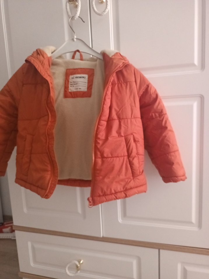 Fermuarlı ve yakalı, turuncu pastel renkte, içi sıcak tutan yumuşak astarlı erkek çocuk montu.