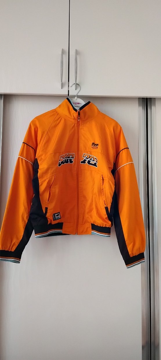 Parlak turuncu renkte, fermuarlı ve baskılı detaylara sahip kadın spor ceketi. Uzun kollu, yuvarlak yakalı ve bol kesimdir.