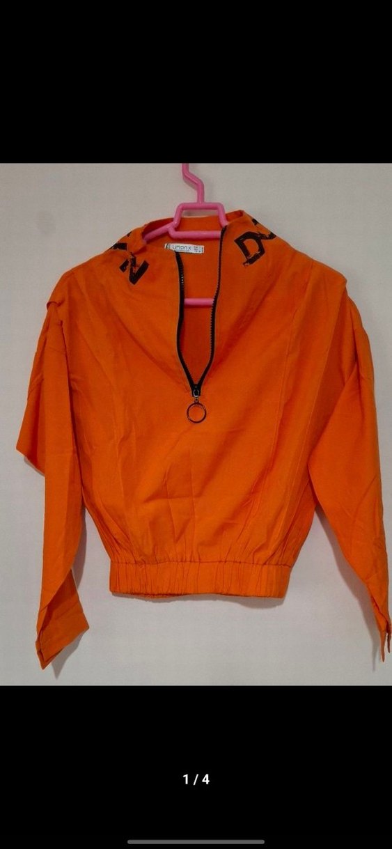 Turuncu renkli, kısa boylu sweatshirt, yakalı ve ön fermuarlı. Uzun kollu ve bol kesim. Sentetik kumaştan, baskılı detaylı. Renkli athleisure tarzda rahat günlük kullanım için ideal.