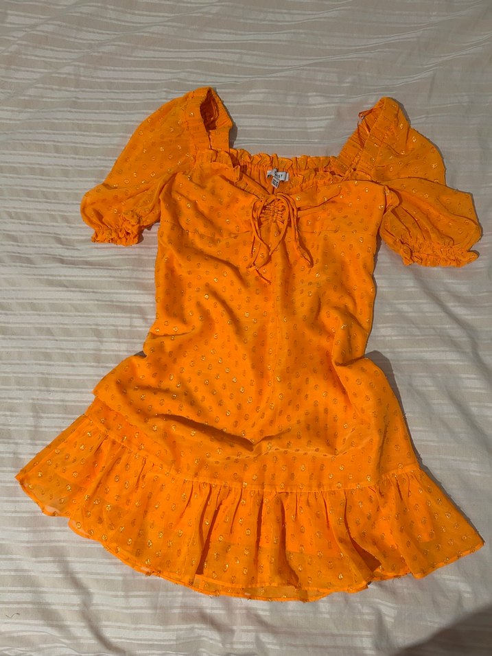 Turuncu renkte, bol kesim kısa kollu mini elbise. Fırfır detaylı, kayık yaka ve parlak batik desenli, romantik akşamlar için uygun.