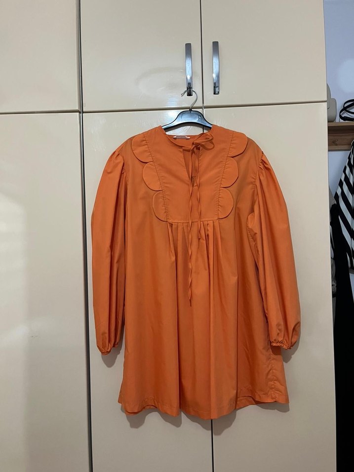 Parlak turuncu keten kumaştan, uzun kollu ve yakalı, bol kesim Fırfır detayları ve midi boy uzunluğu vardır, günlük kullanıma uygundur. #hooopstore