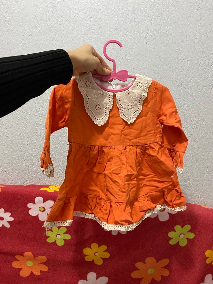 Turuncu renkli, uzun kollu, yakalı ve dantelli detaylı kız çocuk elbisesi, nakışlı fırfırlarla bohem tarzı sunar.