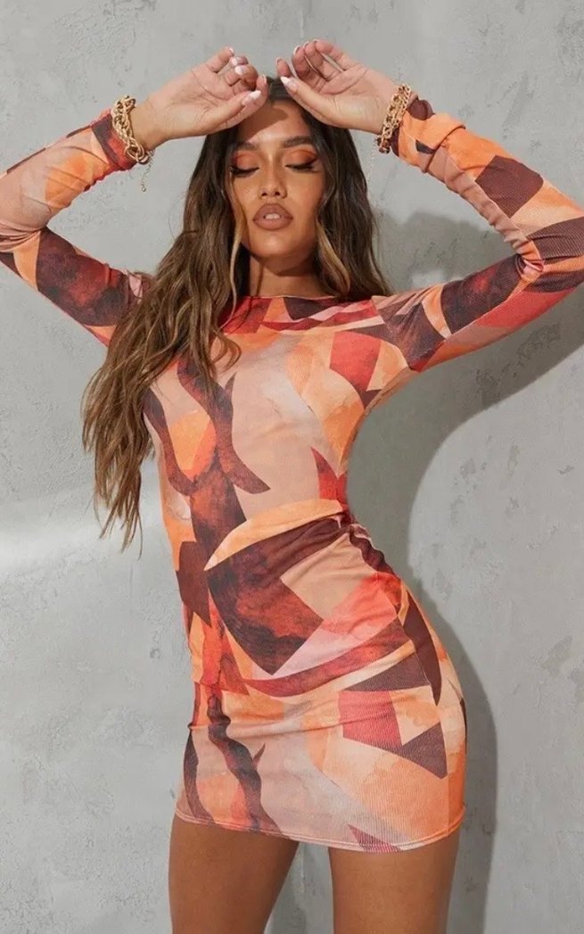 Turuncu Geometrik Desenli Mini Elbise